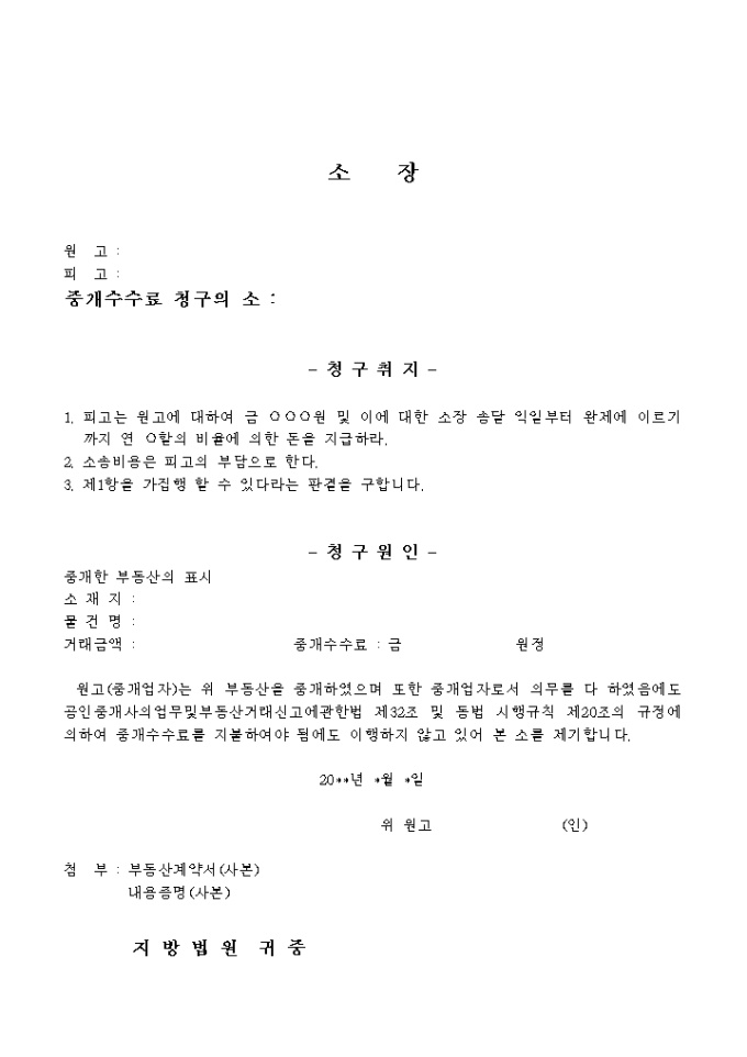 9,000원/월부동산 중개업자에게 중개수수료를 지불하지 않는 건에 대한 소를 제기하는 내용의 중개수수료 소장입니다.