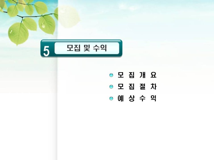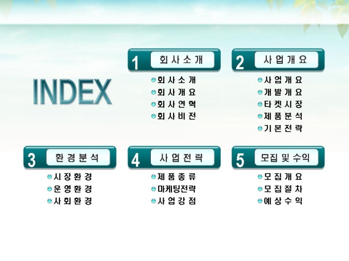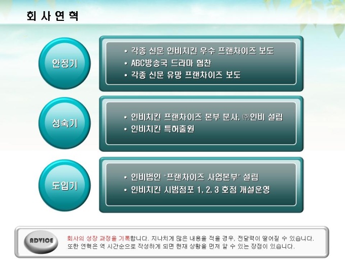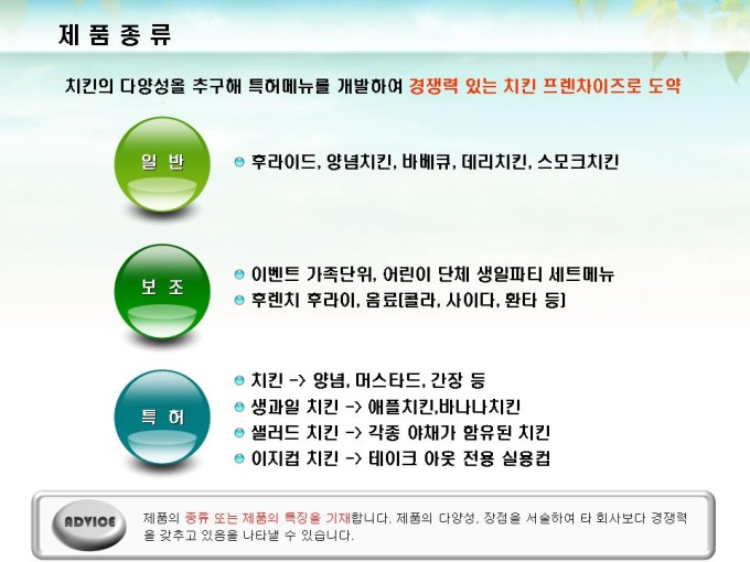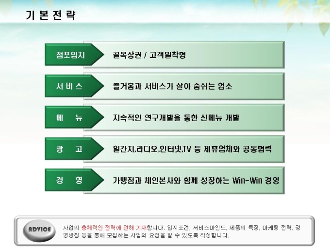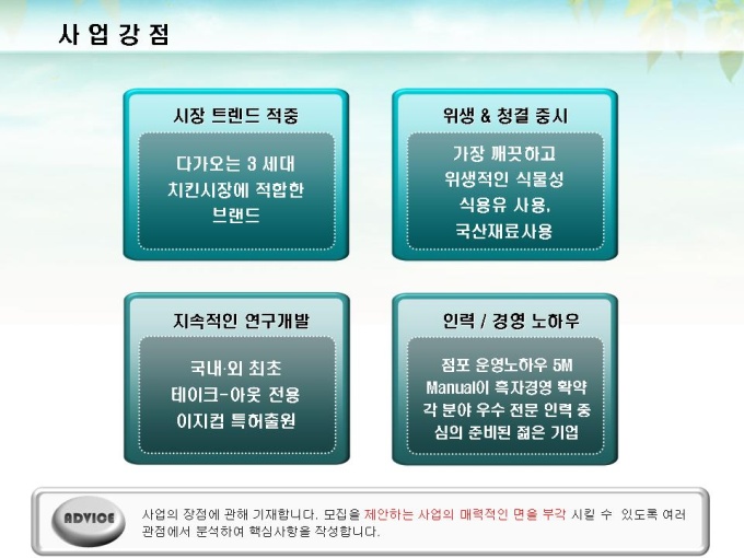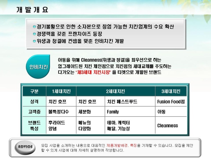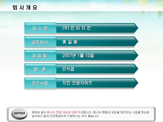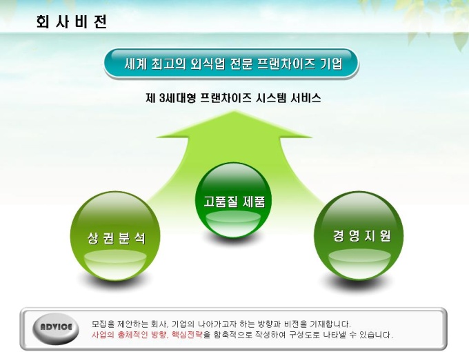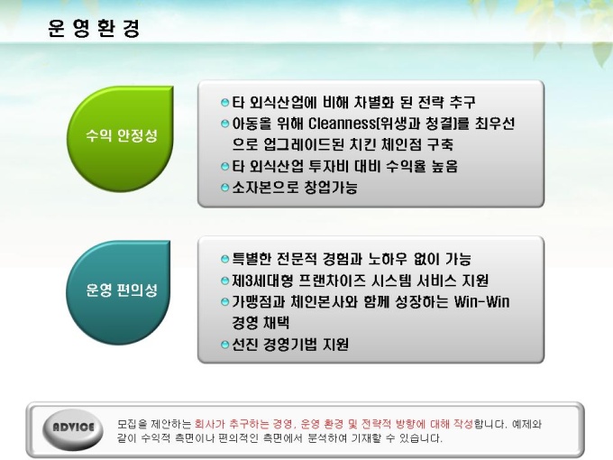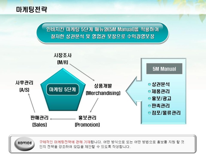체인점 및 대리점 모집에 대한 표준제안서서입니다. 프레젠테이션을 위한 애니메이션 슬라이드, 숫자만 입력하면 자동 완성되는 자동차트, 표준화된 목차 및 전문가의 조언이 포함되어 있습니다.