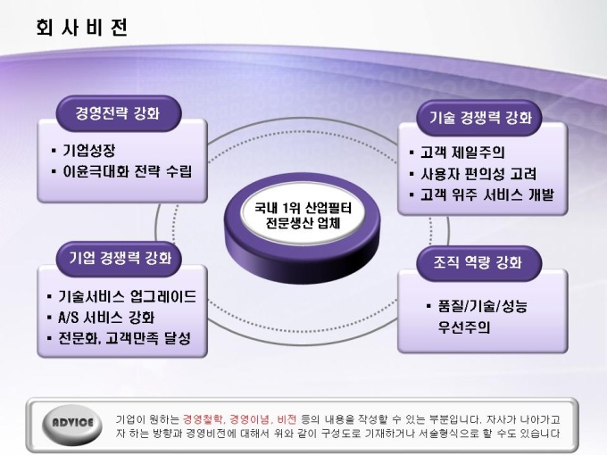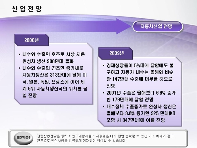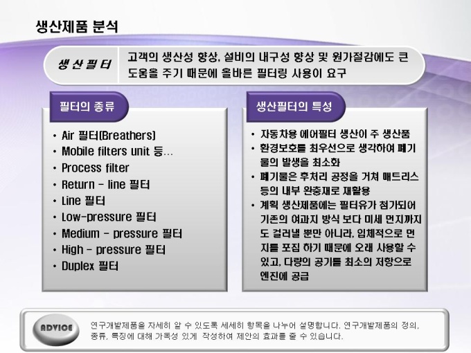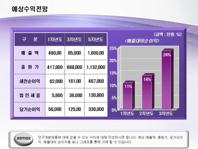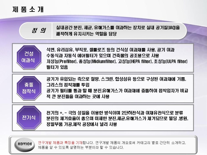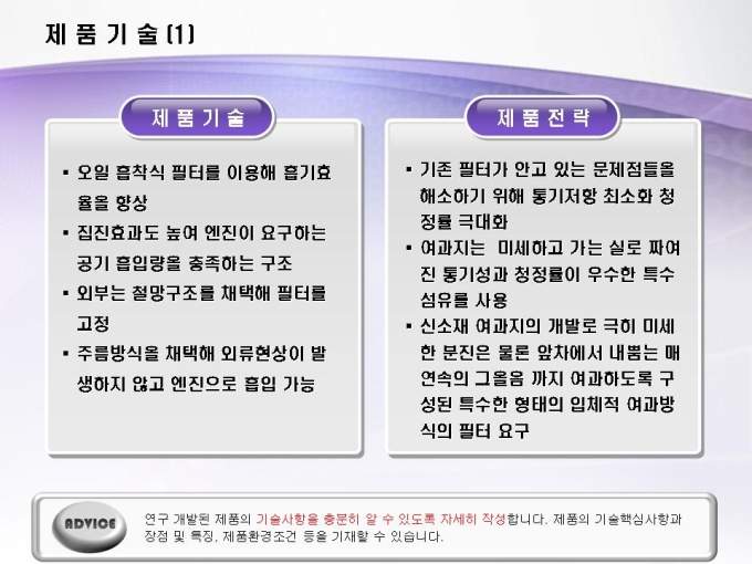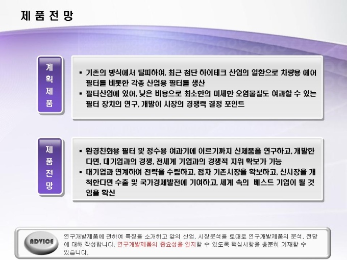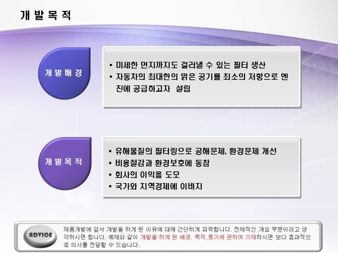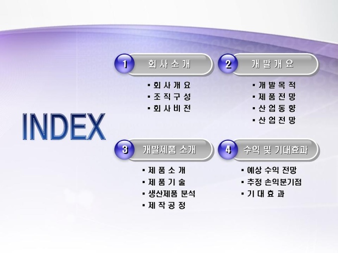 제품, 시스템 등의 연구개발에 대한 표준제안서입니다. 프레젠테이션을 위한 애니메이션 슬라이드, 숫자만 입력하면 자동 완성되는 자동차트, 표준화된 목차 및 전문가의 조언이 포함되어 있습니다.