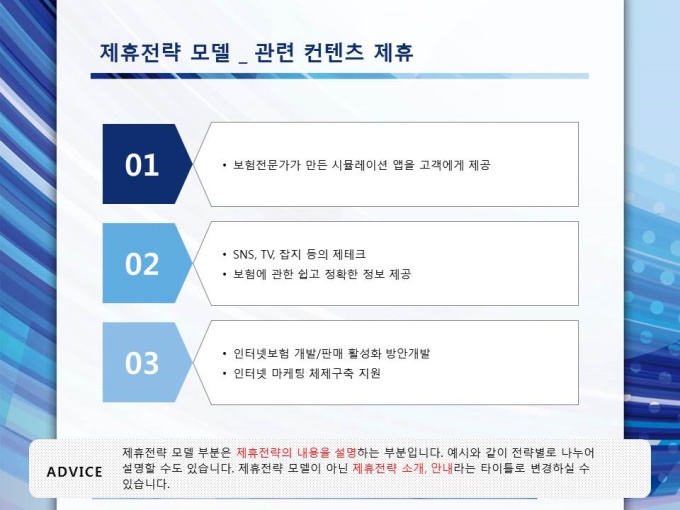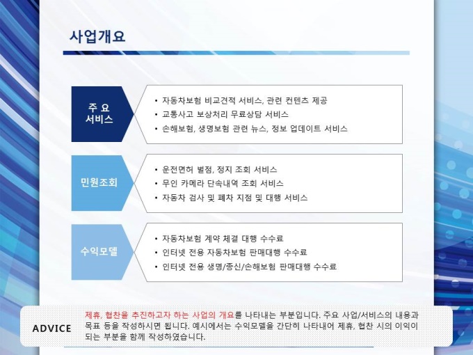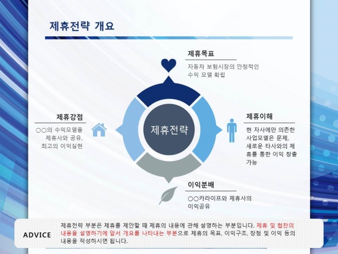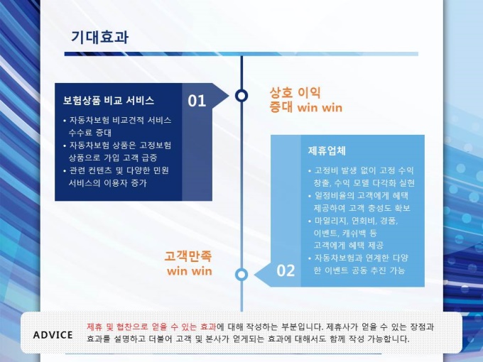 제휴, 협찬에 대한 표준 제안서입니다. 프레젠테이션을 위한 애니메이션 슬라이드, 숫자만 입력하면 자동 완성되는 자동차트, 표준화된 목차 및 전문가의 조언이 포함되어 있습니다.