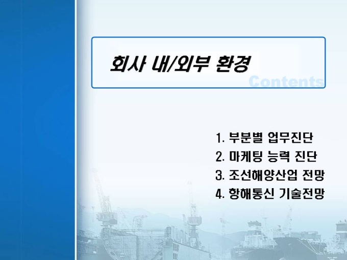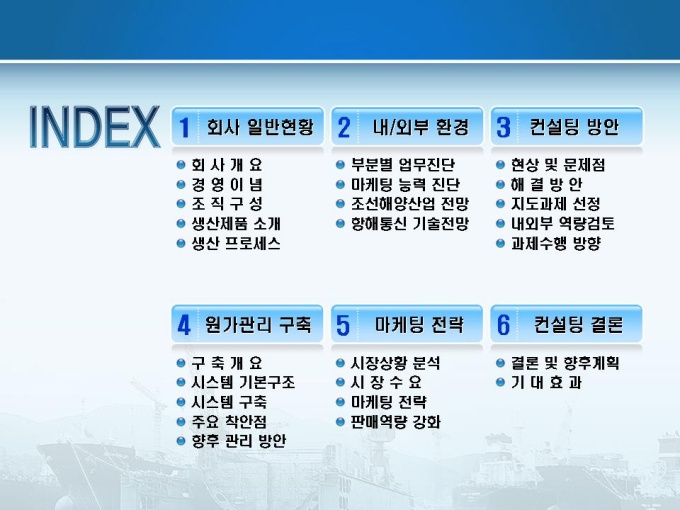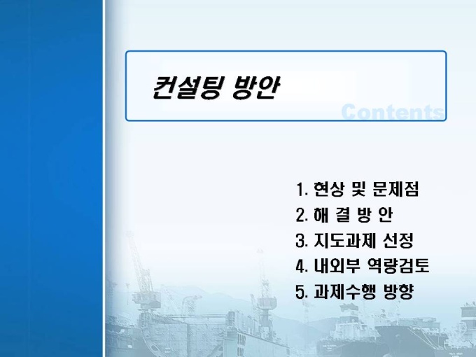 향해장비 및 소프트웨어 개발업페의 전략수립 컨설팅 보고서입니다. 목차는 1.회사 일반현황 2.내/외부 환경 3.컨설팅 방안 4.원가관리 시스템 5.마케팅 전략 6.컨설팅 결론으로 구성되어있습니다.