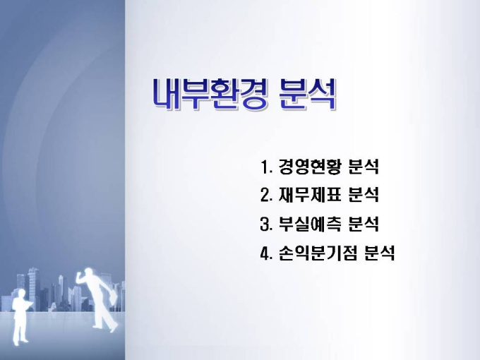 유동성은 다소 떨어지나 안정성과 발전성을 충분히 가지고 있으며, 내부적으로는 매우 우수하지만, 외부환경(경쟁업체의 출현 등)에 대한 분석과 이에 대비한 전략 구축이 부족한 것으로 보임
