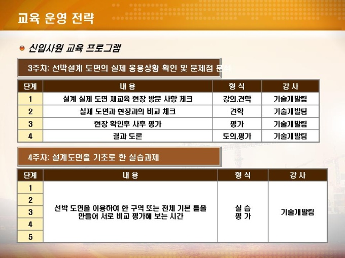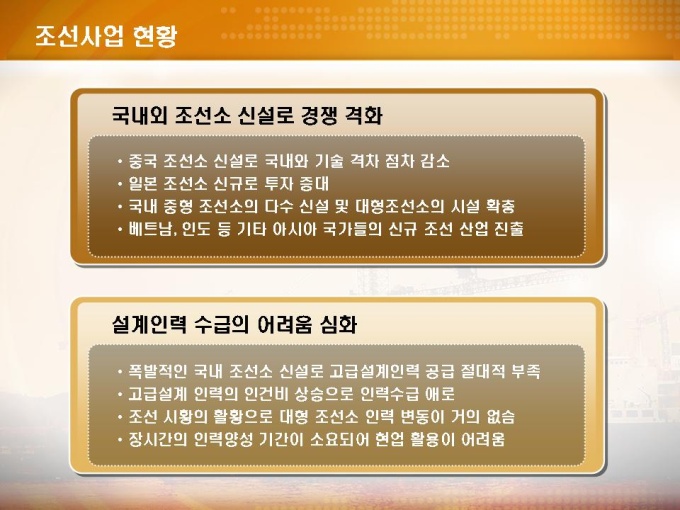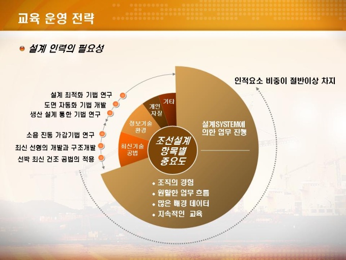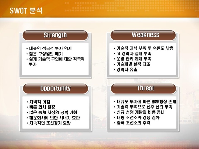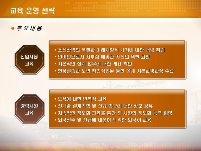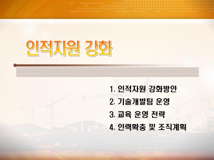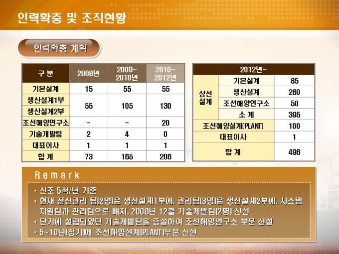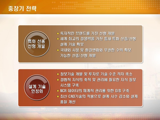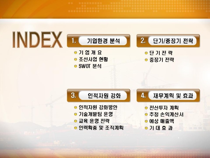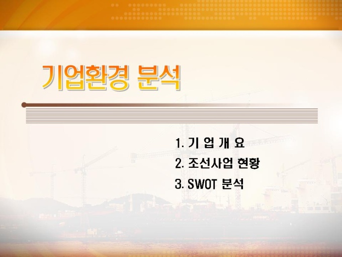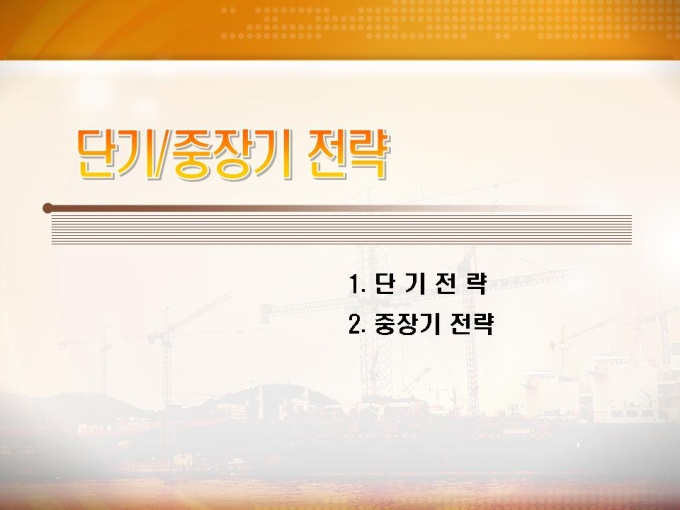 조선업체의 중장기 전략에 관한 사업계획서입니다. 목차는 1.기업환경 분석 2.단기 및 중장기 전략 3.인적자원 강화 4.재무계획 및 효과로 구성되어있습니다.