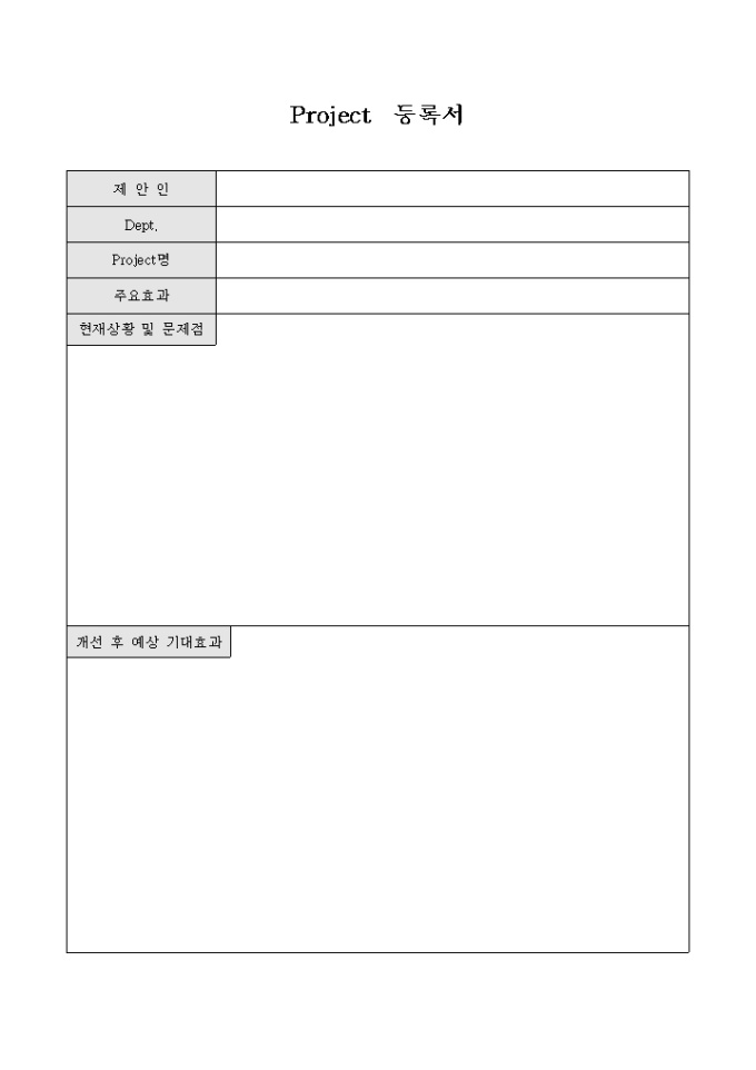 9,000원/월Project 등록서 입니다. Project 제안인, Dept, Project명, 주요효과 관한 항목과 현재상황 및 문제점, 개선 후 예상 기대효과를 자유로이 기술할 수 있는 Project 등록서에 양식입니다.