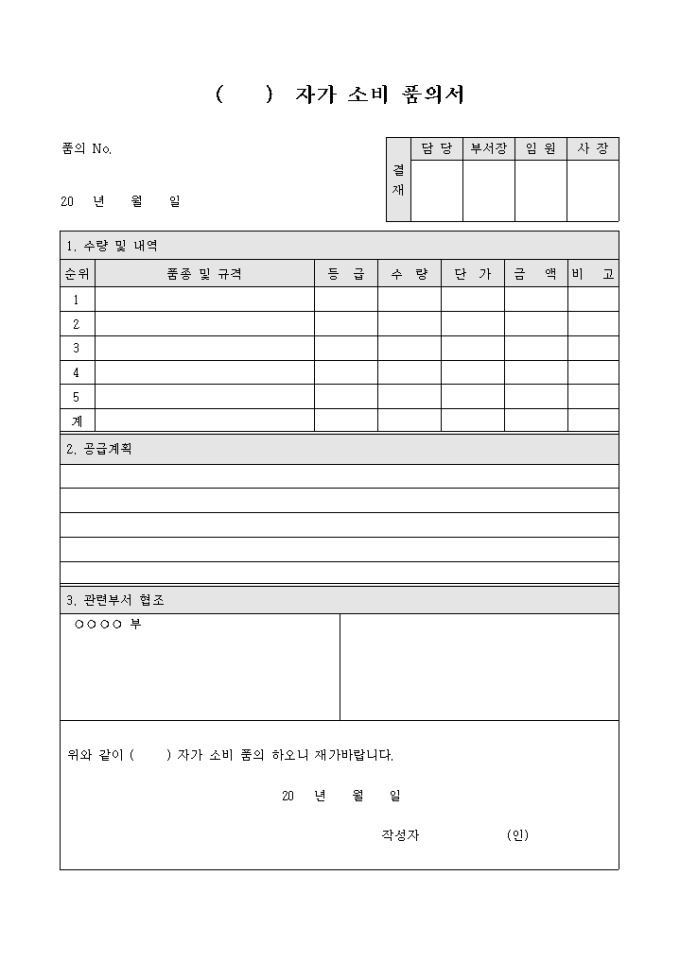 9,000원/월자가소비품의서 양식입니다. 품의 항목의 수량 및 내역, 공급계획 등을 기록하고 관련된 부서의 협조등을 구하는 내용이 포함되어 있습니다.