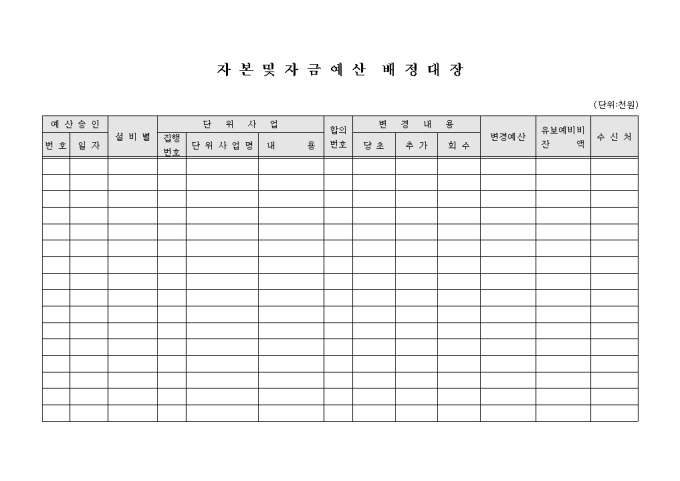 9,000원/월설비별, 단위사업별 예산의 수립 및 변경내용과 유보예비비를 기재할 수 있는 자본 및 자금의 예산배정대장 양식입니다.