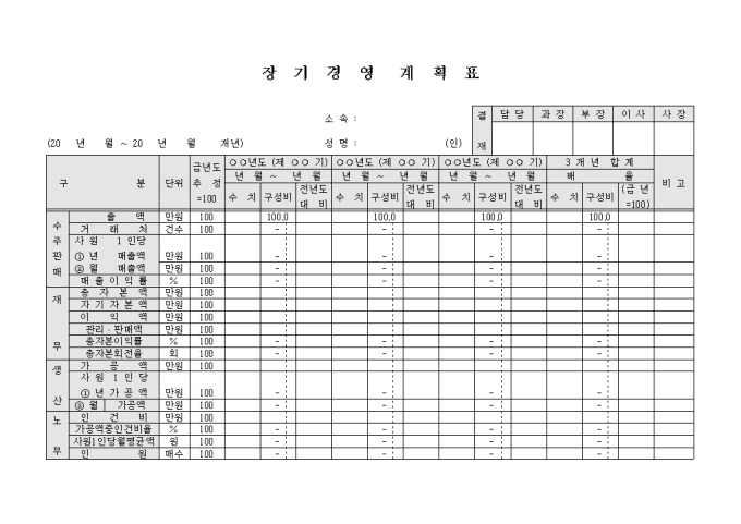 수주판매, 재무, 생산, 노무부문 등이 상세항목들로 구성되어 있으며 이들에 관해 3개년의 장기경영계획을 작성할 수 있는 장기경영계획표 양식입니다.