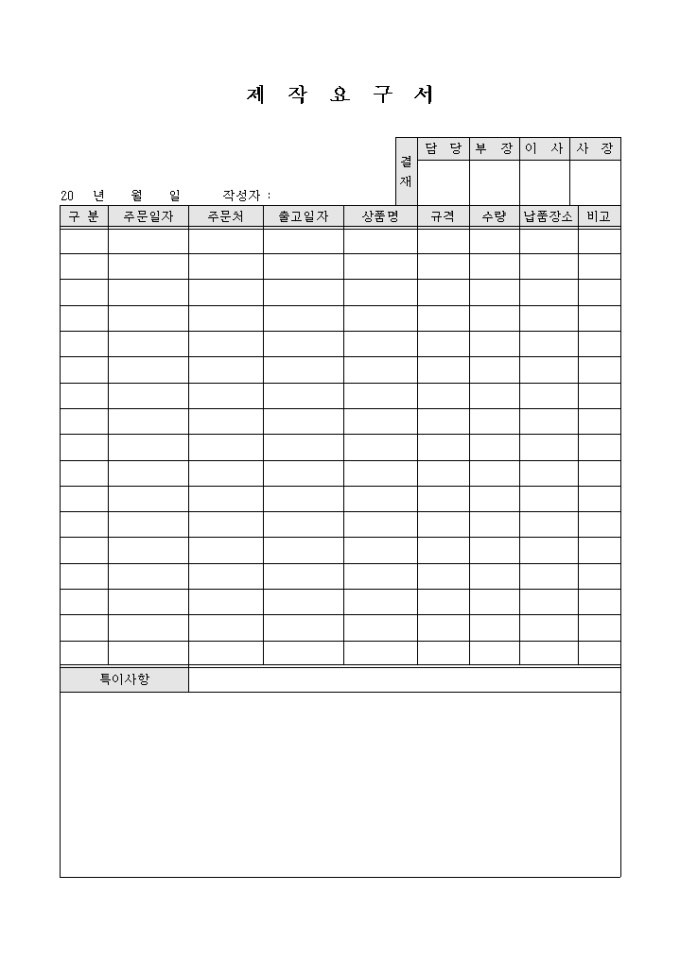 9,000원/월제작요구서 양식으로서 주문일자별로 주문처와 출고일자, 상품명, 규격, 수량, 납품장소 등의 정보를 기록할 수 있습니다.