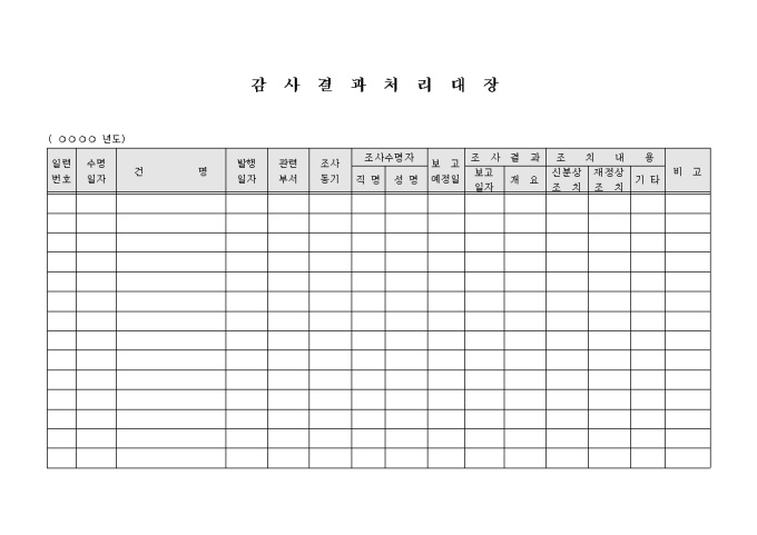 감사내용에 대한 조사수명자, 조사결과 및 조치내용을 기록하는 감사결과처리대장 양식입니다.
