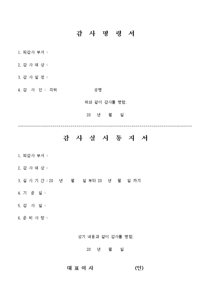 9,000원/월피감사부서, 감사대상, 감사일정, 감사인 등의 항목으로 구성된 감사명령서 및 감사실시통지서 서식입니다.