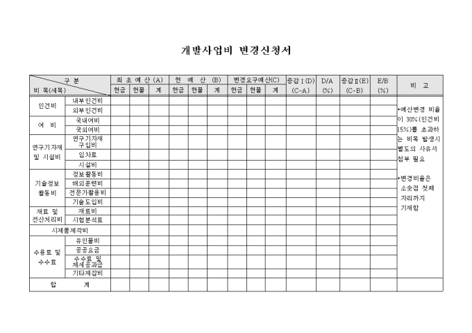 9,000원/월개발사업비 변경신청서로 개발사업비 변경에 필요한 현금, 현물, 계로 계산된 최초예산, 현예산, 변경요구예산, 증감률 등을 기재할 수 있습니다.