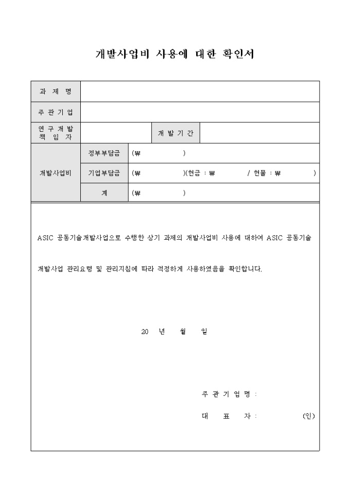 9,000원/월개발사업비 사용에 대한 확인을 위해 과제명, 주관기업, 연구개발 책임자, 개발기간, 정부와 기업간의 부담금 구분 개발사업비 등의 항목으로 구성된 개발사업비 사용에 대한 확인서 양식입니다.
