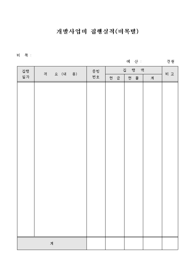 9,000원/월개발사업비 집행실적을 비목별로 집행일자, 적요, 증빙번호, 집행액 등으로 작성 할 수 있는 개발사업비 집행실적(비목별)표 양식입니다.