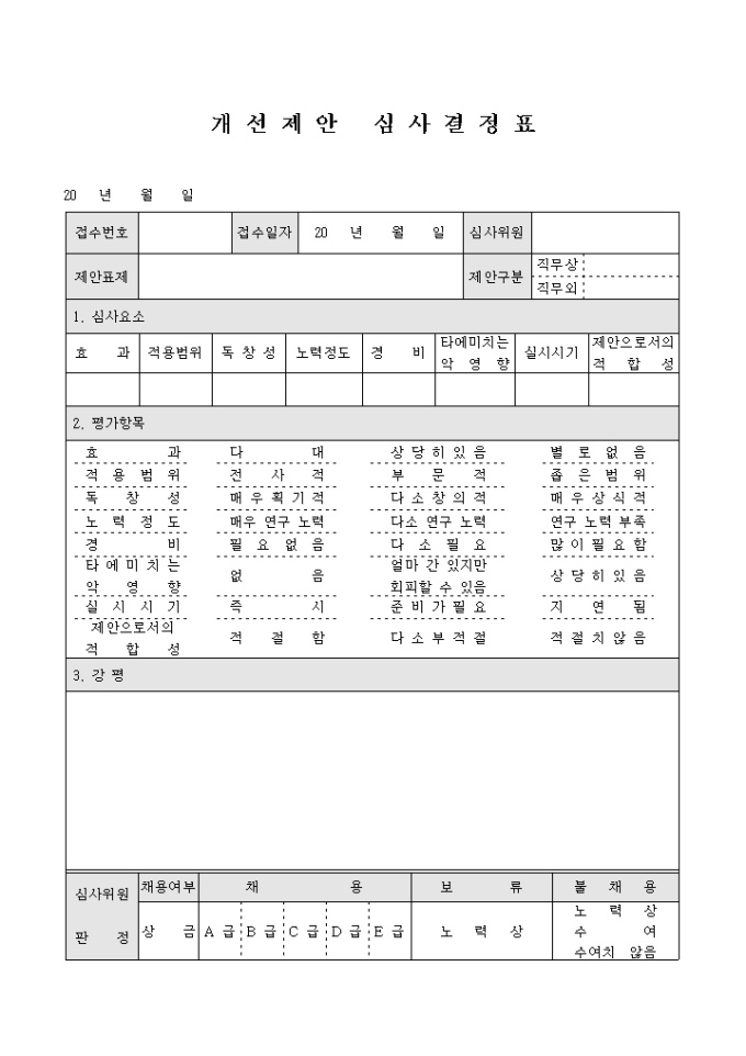 9,000원/월업무개선제안에 대한 평가항목별 심사결과를 나타내는 개선제안심사결정표 양식입니다.