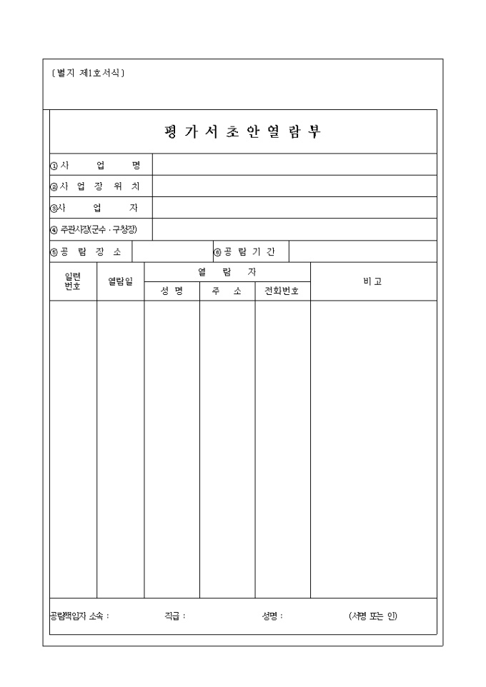 9,000원/월별지 제1호서식 사업명, 사업자윛, 사업자, 주관시장(군수, 구청장)등으로 구성된 평가서 초안열람부 양식입니다.