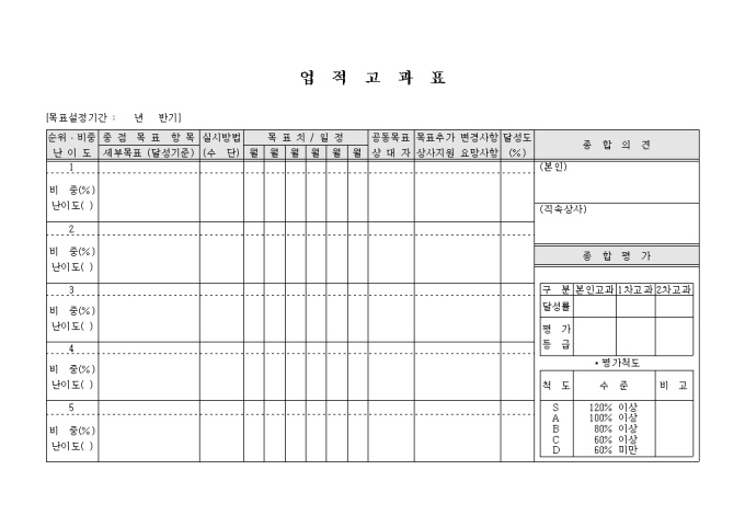 9,000원/월개인별 업적고과표 양식입니다. 목표 난이도에 따라 설정기간을 정하여 업무를 평가하는 것으로, 중점목표항목 , 실시방법, 목표치/일정, 공동목표 상대자, 목표추가ㆍ변경사항, 상사지원 요망사항, 달성도, 본인과 직속상사의 종합의견을 통하여 업적고과표를 작성합니다.