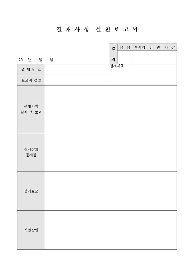 9,000원/월결재된 사항에 대한 실시사항의 효과, 문제점, 평가내용, 개선방안을 보고하는 결재 사항 실천 보고서(2) 양식입니다.