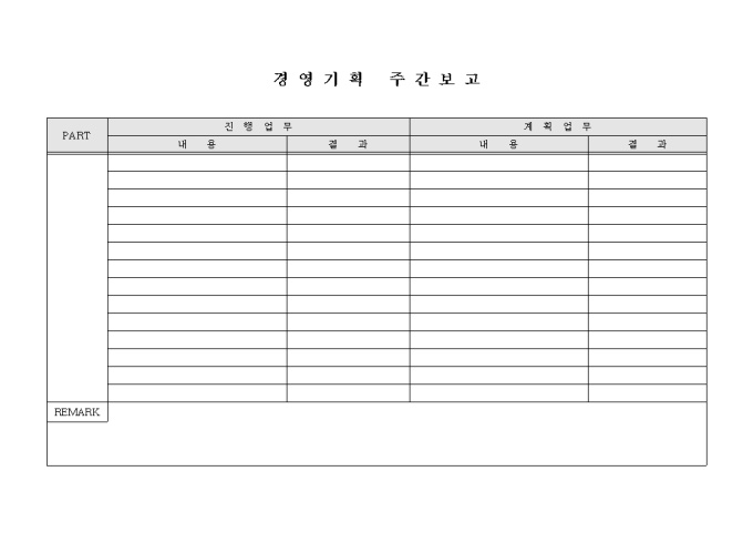 한 주간의 진행업무, 계획업무에 관하여 내용, 결과를 기록할 수 있는 경영기획 주간보고에 관한 양식입니다.