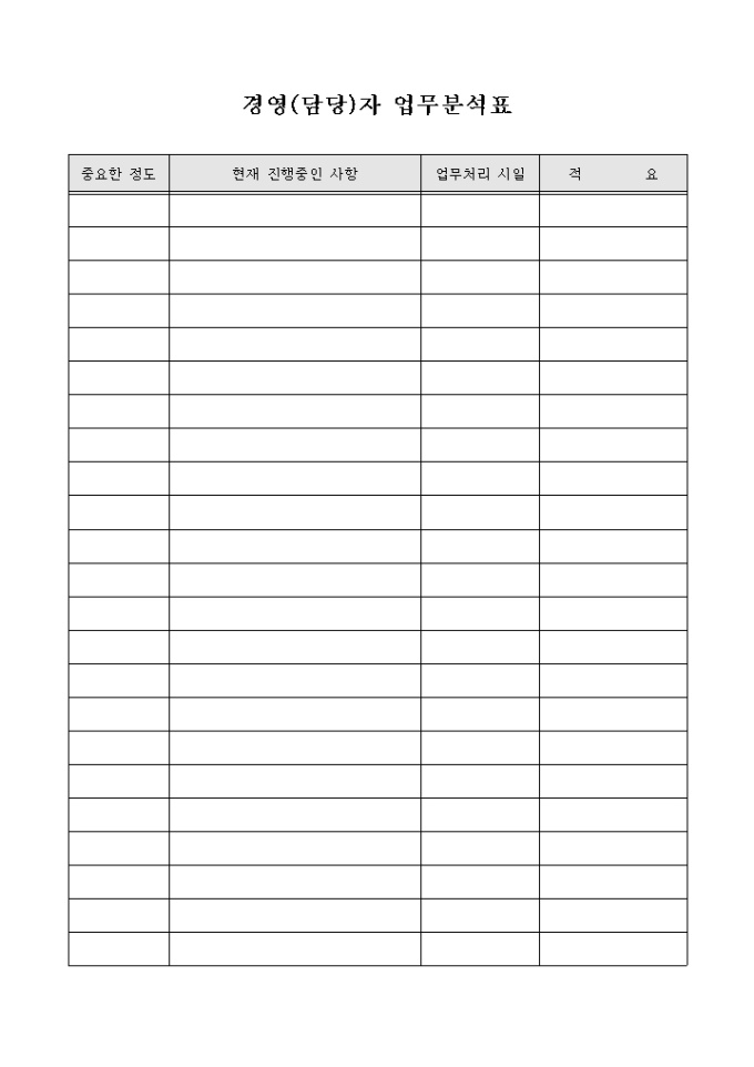 9,000원/월경영자의 현재진행중인 업무처리를 성과여부를 알 수 있는 경영자업무 분석표 양식입니다.