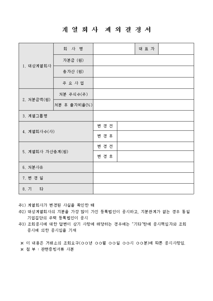 계열회사가 변경된 사실을 확인한 때 사용하는 계열회사 제외결정서 양식입니다.