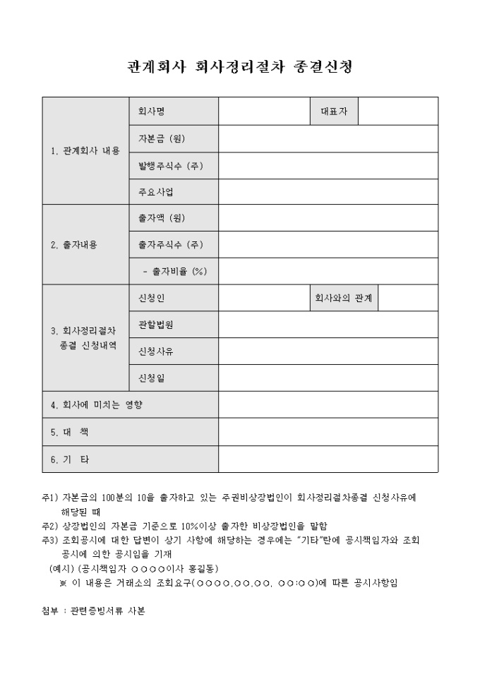 관계회사 회사정리절차 종결신청 양식입니다. 해당 신청사유에 적합할 때 사용하는 관계회사 회사정리절차 종결신청 작성 자료입니다.