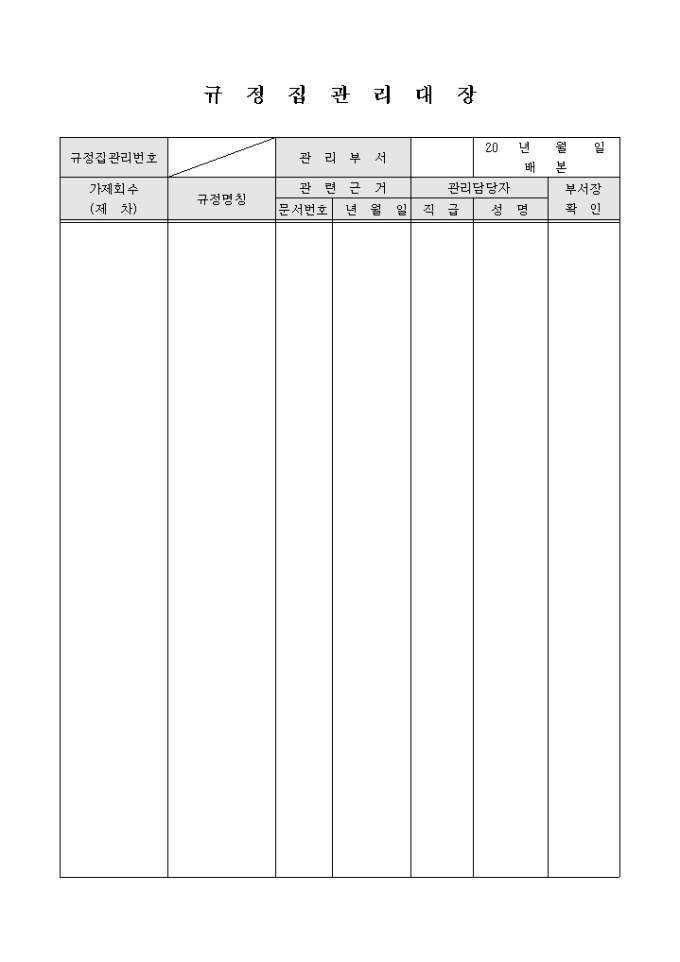 규정집관리번호, 관리부서, 문서번호, 년월일, 직급, 성명, 부서장확인 등의 내용으로 구성된 규정집 관리대장 양식입니다.