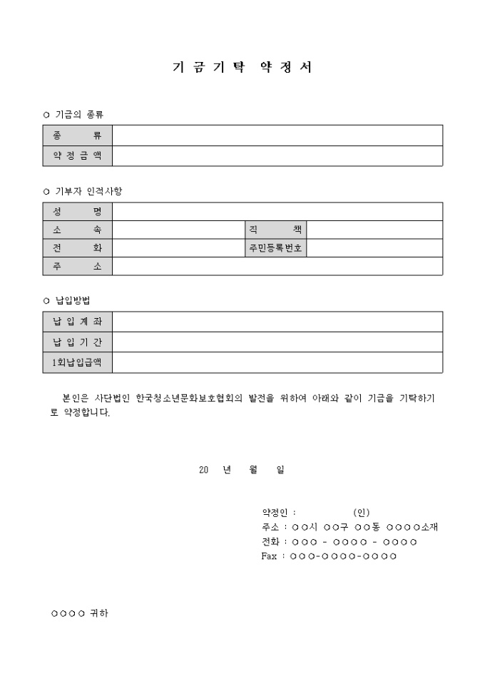9,000원/월기금 기탁 약정서 양식으로 기금의 종류와 금액, 기부자 인적사항, 납입방법과 납입금액을 기록할 수 있는 기금 기탁 약정서에 관한 양식입니다.