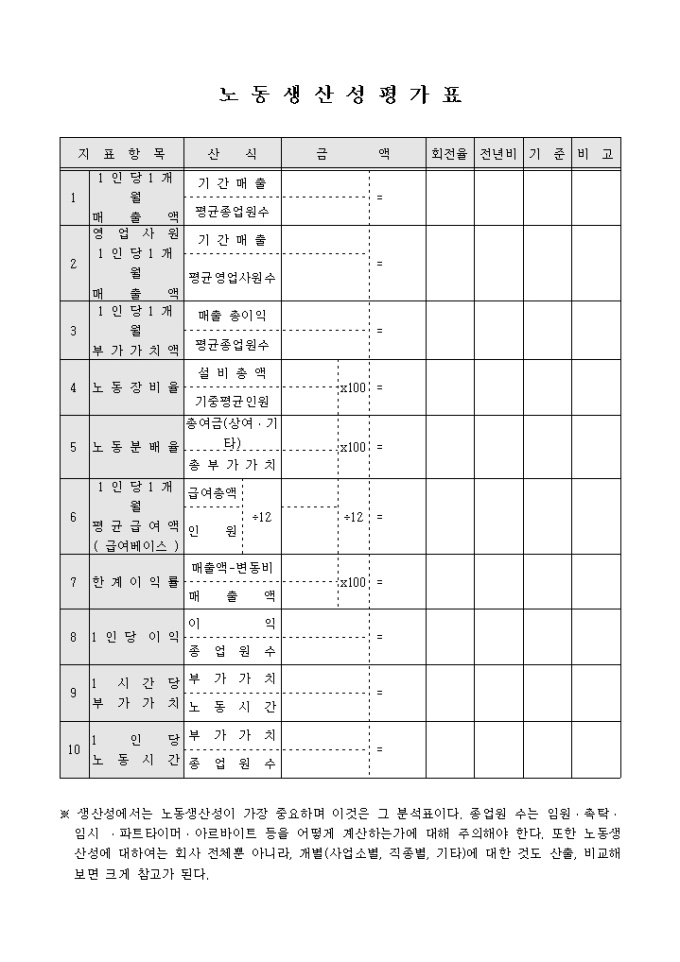 9,000원/월지표항목, 산식, 금액산출, 회전율, 전년비 등을 통해 기준을 밝혀낼 수 있는 종업원 1인당 노동생산성을 평가할수 있는 노동생산성평가표 양식입니다.