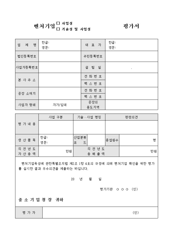 벤처기업 육성에 관한 특별조치법에 따라 중소기업청에 제출하는 벤처기업(사업성, 기술성및사업성)평가 양식입니다