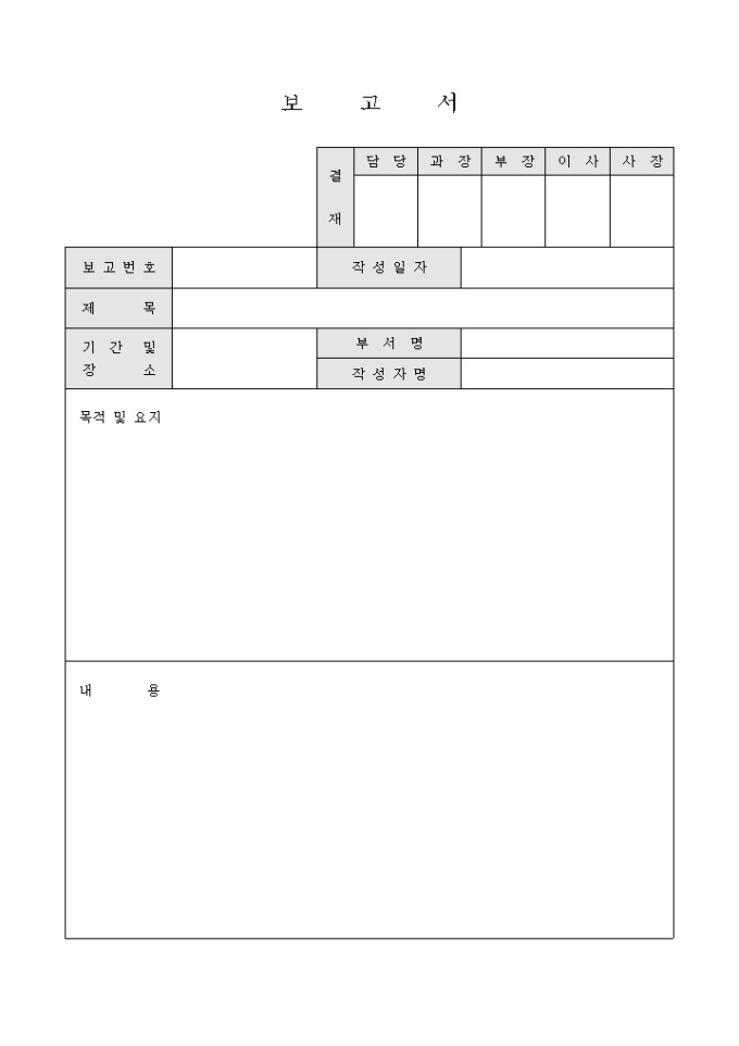 9,000원/월제목, 기간 및 장소, 부서명, 작성자명, 목적 및 요지, 내용 등으로 구성되어 있는 보고서 양식입니다.
