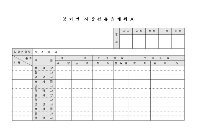 9,000원/월각 제품별 시장전체 경쟁사 제품, 당사 제품의 예상되는 시장점유율을 분기별로 기록할 수 있습니다.