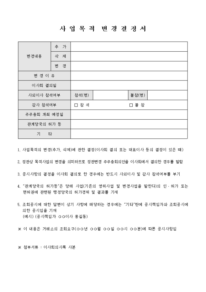 9,000원/월사업목적의 변경(추가,삭제)내용, 이유, 이사회결의일, 사외이사 참석여부, 감사참석여부, 주주총회개최일, 관계당국의 허가 등으로 구성된 사업목적변경 결정서입니다.