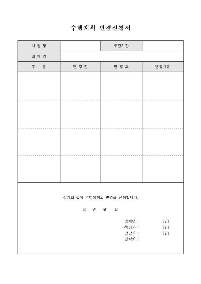 9,000원/월사업명, 주관기관, 과제명, 변경전, 변경후, 변경사유 등으로 구성된 수행계획 변경신청서입니다.