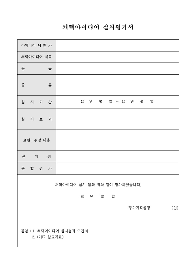 채택아이디어 제목, 실시부서, 실시기간, 실시내용, 의견 등으로 구성된 채택아이디어 운영결과 의견서입니다.