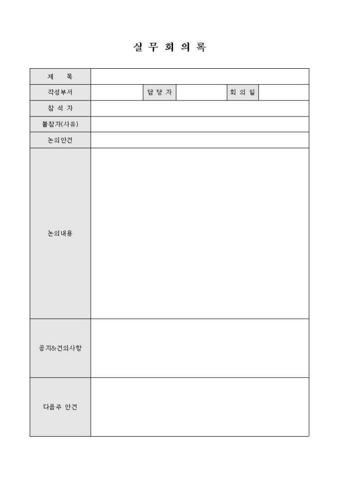 9,000원/월제목, 작성부서, 담당자, 회의일, 참석자, 불참자사유, 논의안건, 논의내용, 공지및건의사항, 다음주 안건에 관하여 기록할 수 있는 실무회의록입니다.