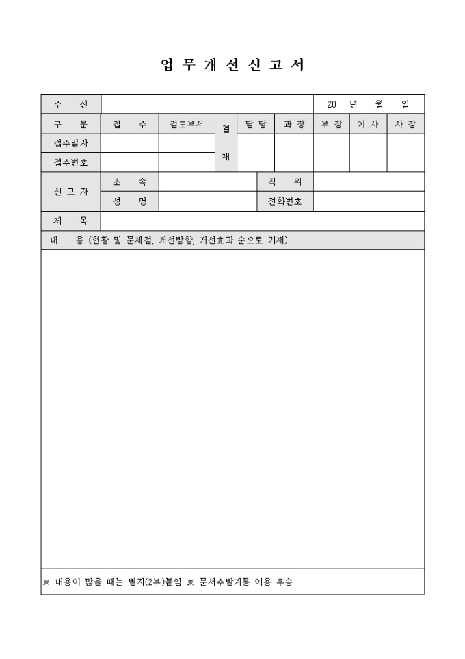 9,000원/월업무현황, 문제점, 개선방향, 개선효과 등으로 구성된 업무개선신고서입니다.