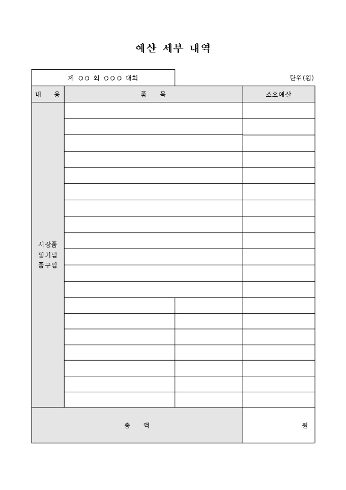 9,000원/월시상품 및 기념품 구입에 대한 예산세부내역서입니다.