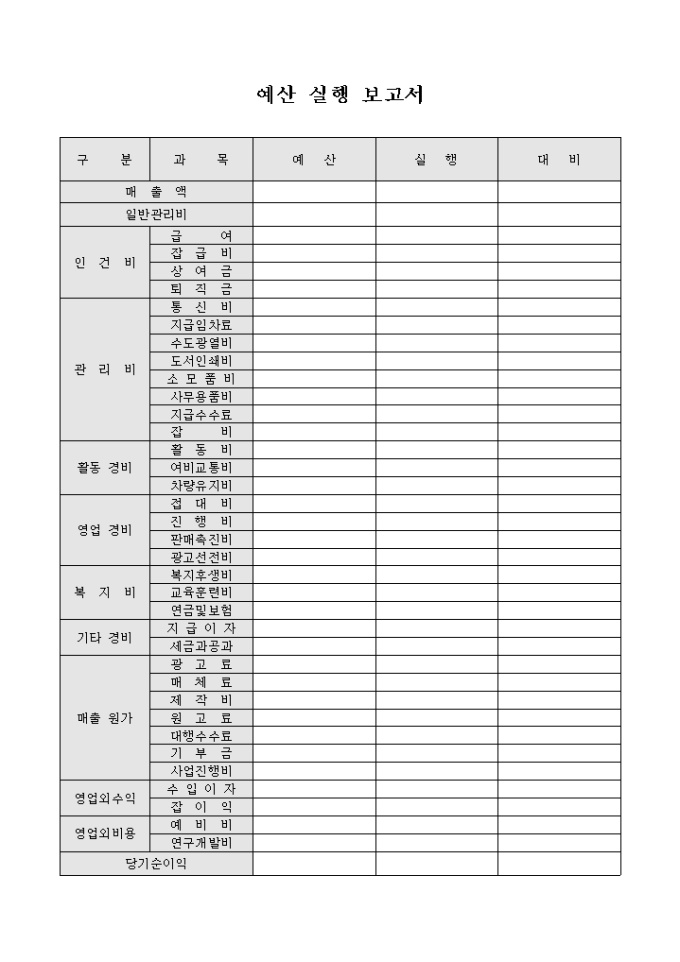 9,000원/월수입과 지출의 각 세부 항목별 예산금액, 실행금액, 예산대비 실행금액 등으로 구성된 예산실행대비표입니다.