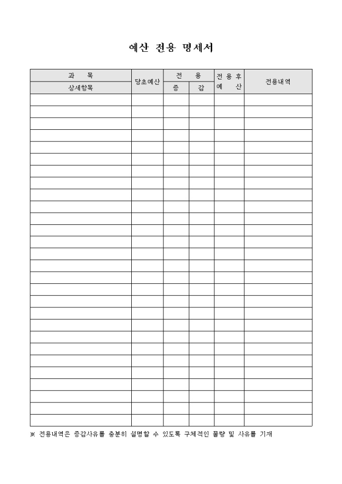 9,000원/월상세항목, 당초예산, 증감, 전용후 예산, 전용내역 등으로 구성된 예산전용명세서입니다.