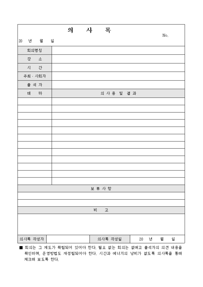 9,000원/월회의명칭, 의사내용, 의사록 작성자 등으로 구성된 의사록식입니다.