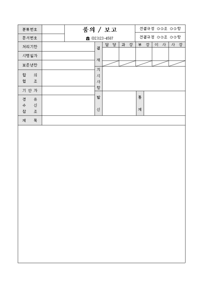 9,000원/월처리기한, 시행일자, 보존연한, 지시사항, 합의 협조, 기안자, 경유, 수신, 발신, 통제, 제목, 보고 내용으로 구성된 품의 및 보고문입니다.