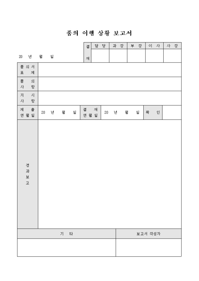 9,000원/월품의서 표제, 품의사항, 지시사항, 경과보고 등의 내용으로 구성된 품의이행 상황보고서 입니다.