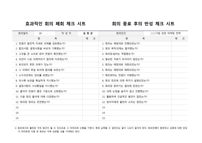 9,000원/월회의 폐회 과정과 회의 종료 후 과정에 대한 반성을 위해 쓰이는 회의폐회체크시트 입니다.