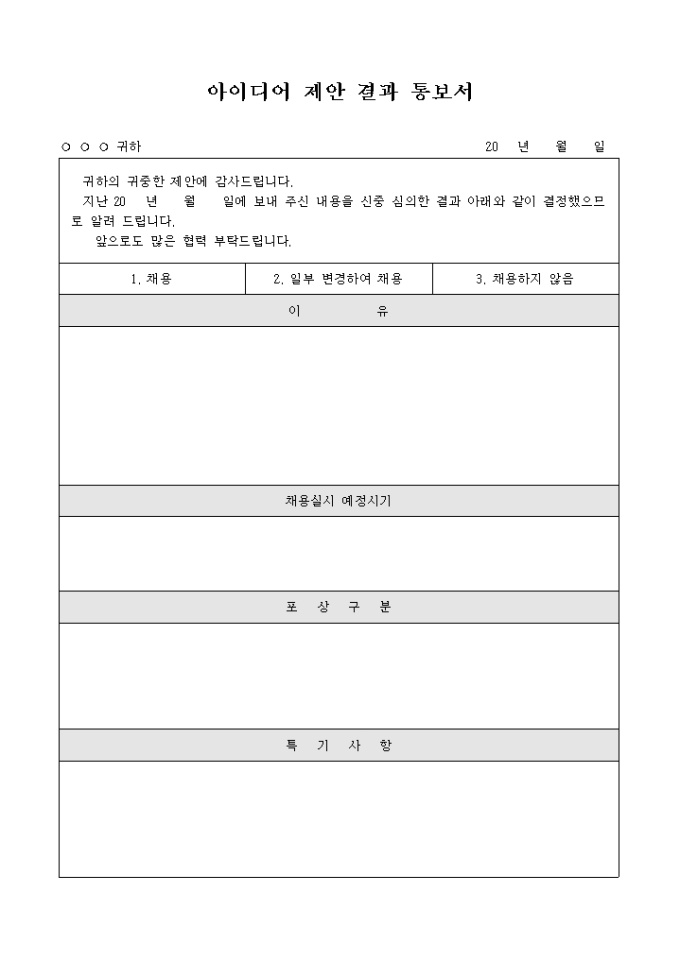 9,000원/월아이디어제안결과 통보서 양식입니다. 아이디어 채용 여부와 이유, 채용예정시기, 포상구분 등의 항목으로 구성되어 있습니다.