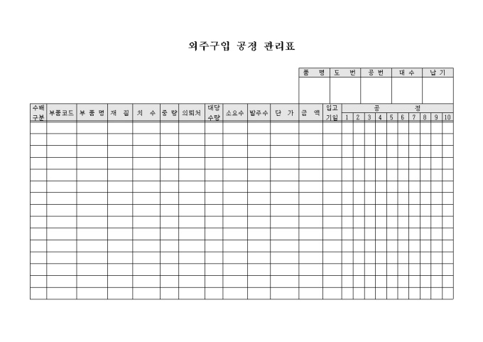 9,000원/월외주시 공정을 관리하기 위한 관리표 양식으로 부품코드, 부품명, 재질, 치수, 중량, 소요수, 발주수, 단가, 금액, 입고기일, 공정단계의 항목으로 구성된 외주구입공정관리표 입니다.