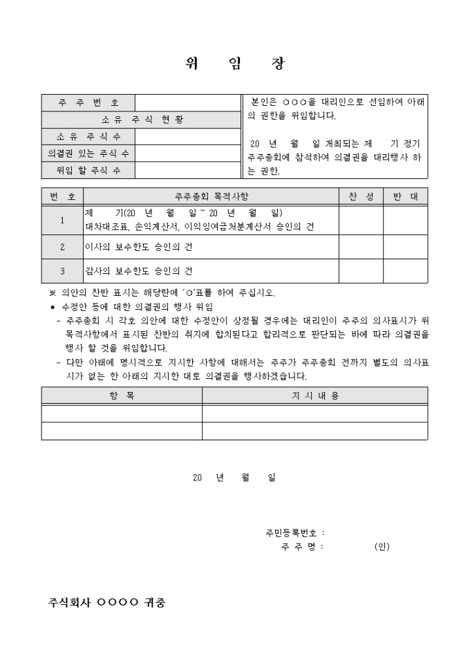 9,000원/월주주총회에서의 대차대조표, 이사감사,보수한도승인에 관한 대리인 위임장 양식입니다.