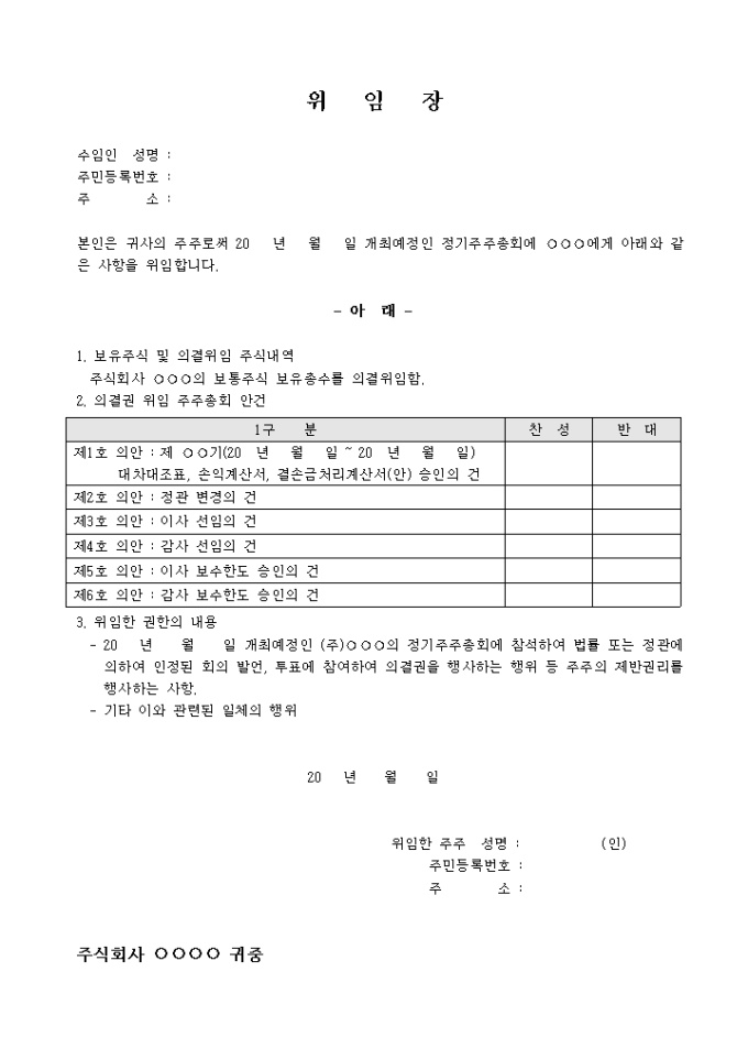 주주총회에서 대차대조표, 정관변경, 이사감사선임 등의 권한을 대리인에게 위임하는 위임장 양식입니다.