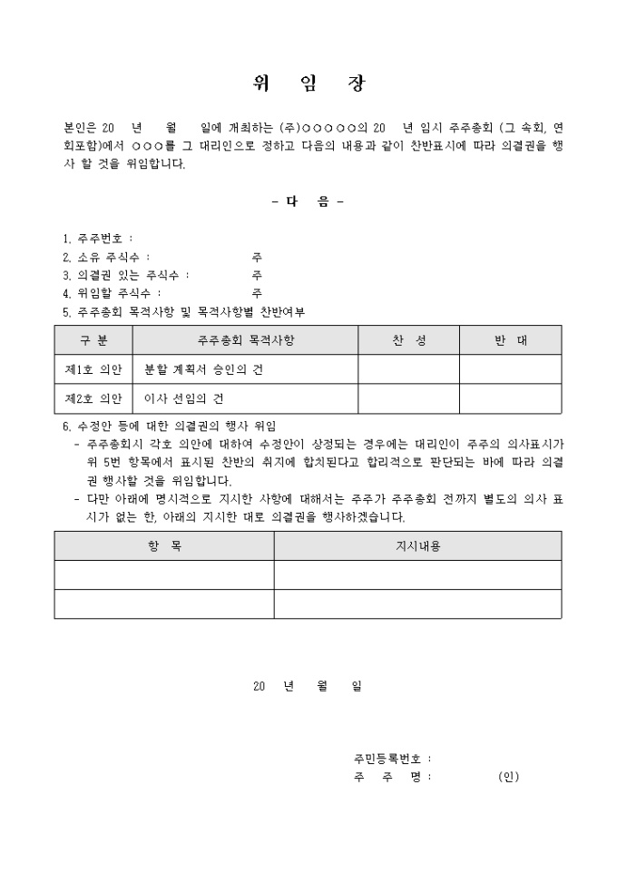 9,000원/월주주총회에서 분할계획서 승인의 건 및 이사선임의 건 에 관한 의결권을 대리인에게 위임하는 양식의 위임장입니다.