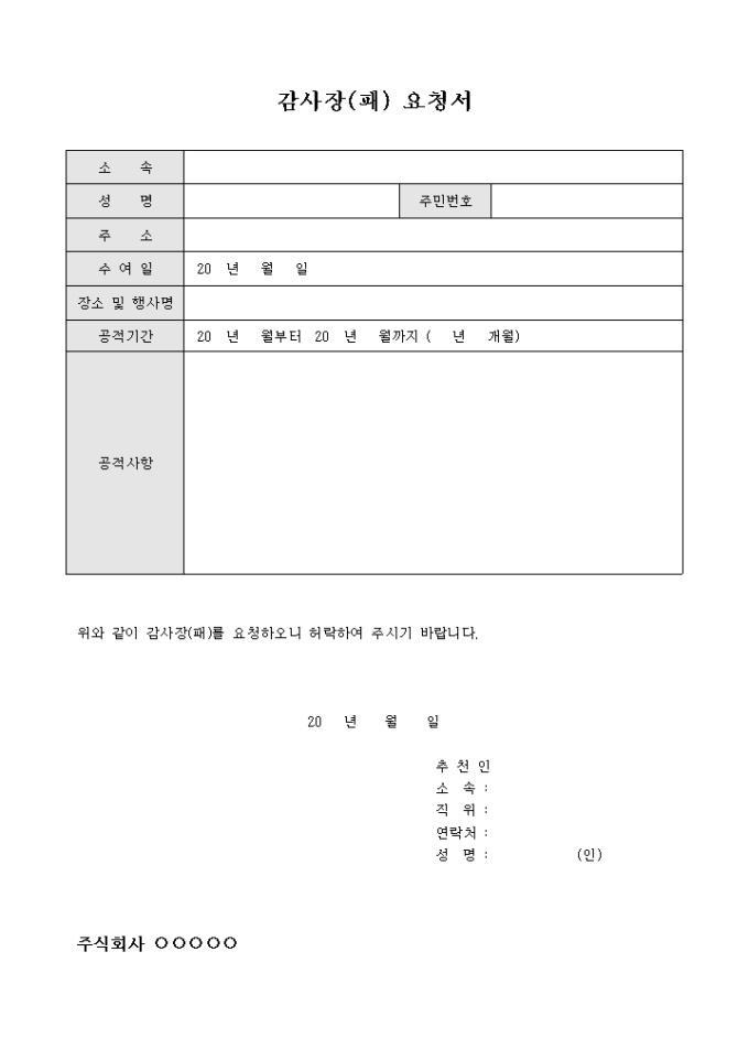 9,000원/월감사장,감사패를 요청시에 사용하는 요청서입니다. 공적사항과 수여일, 추천인등으로 구성되어있습니다.