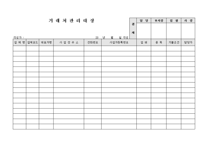 9,000원/월공통적으로 사용되는 거래처관리대장입니다. 주 거래업체명과 사업자의 주소 사업자등록번호와 종목등으로 구성되어 있습니다.
